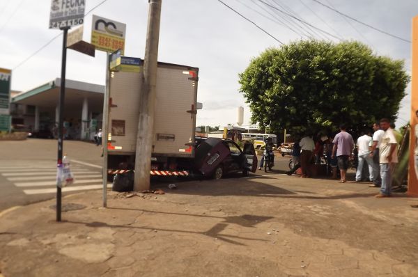 Caminhão desgovernado bate em carro e poste de energia